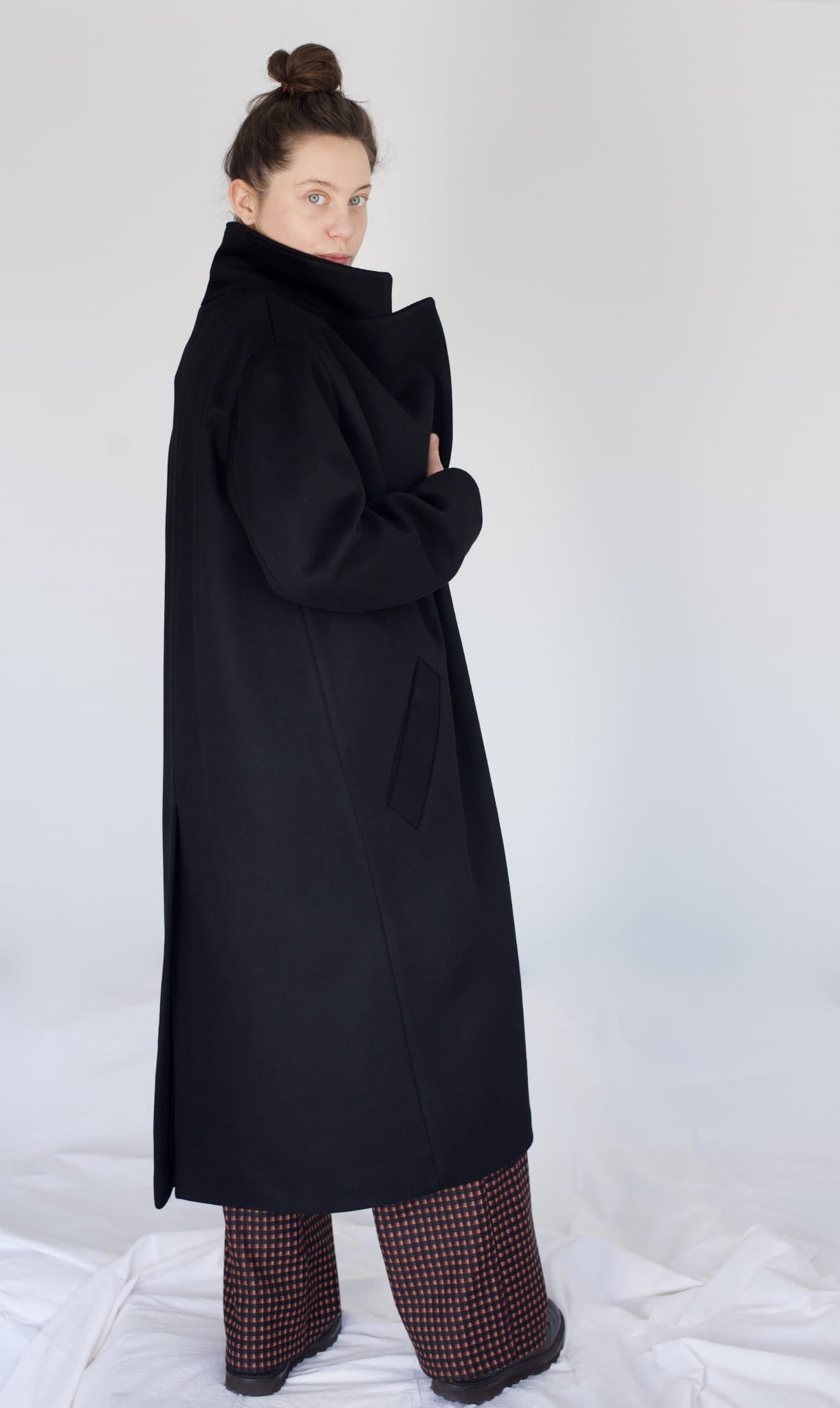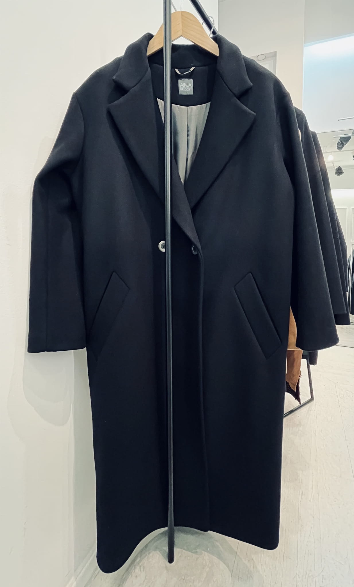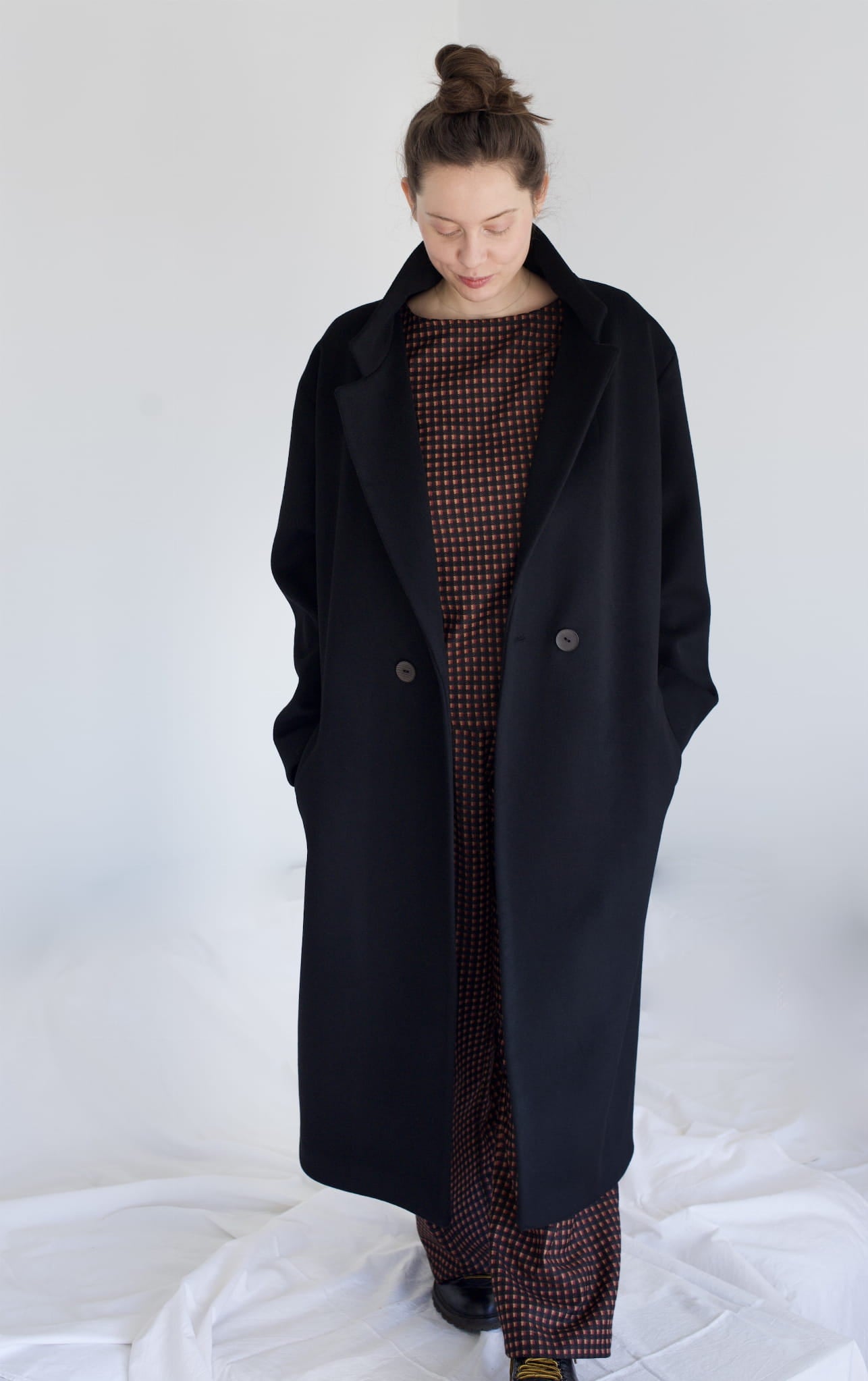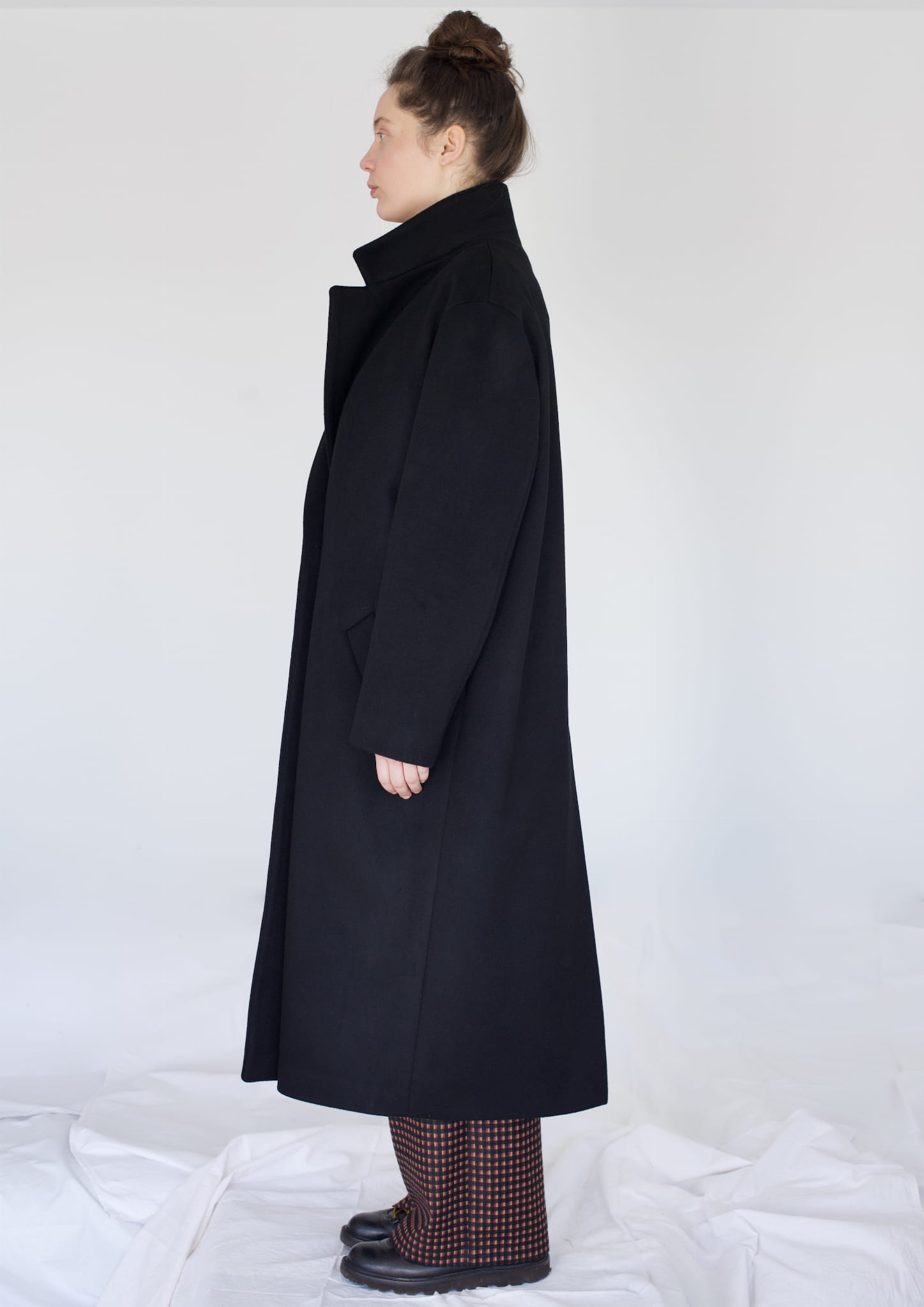 Czarny, dwurzędowy płaszcz. Uszyty jest z grubej wełny. Posiada wiskozową podszewkę. Jest oversizowy. Zapinany na metalowe guziki, posiada dwie kieszenie, rozcięcie z tyłu oraz lekko opuszczone szerokie ramiona. We wszystkich zimowych płaszczach wszyte jest również ocieplenie duńskie, które chroni przed wilgocią i zimnem.