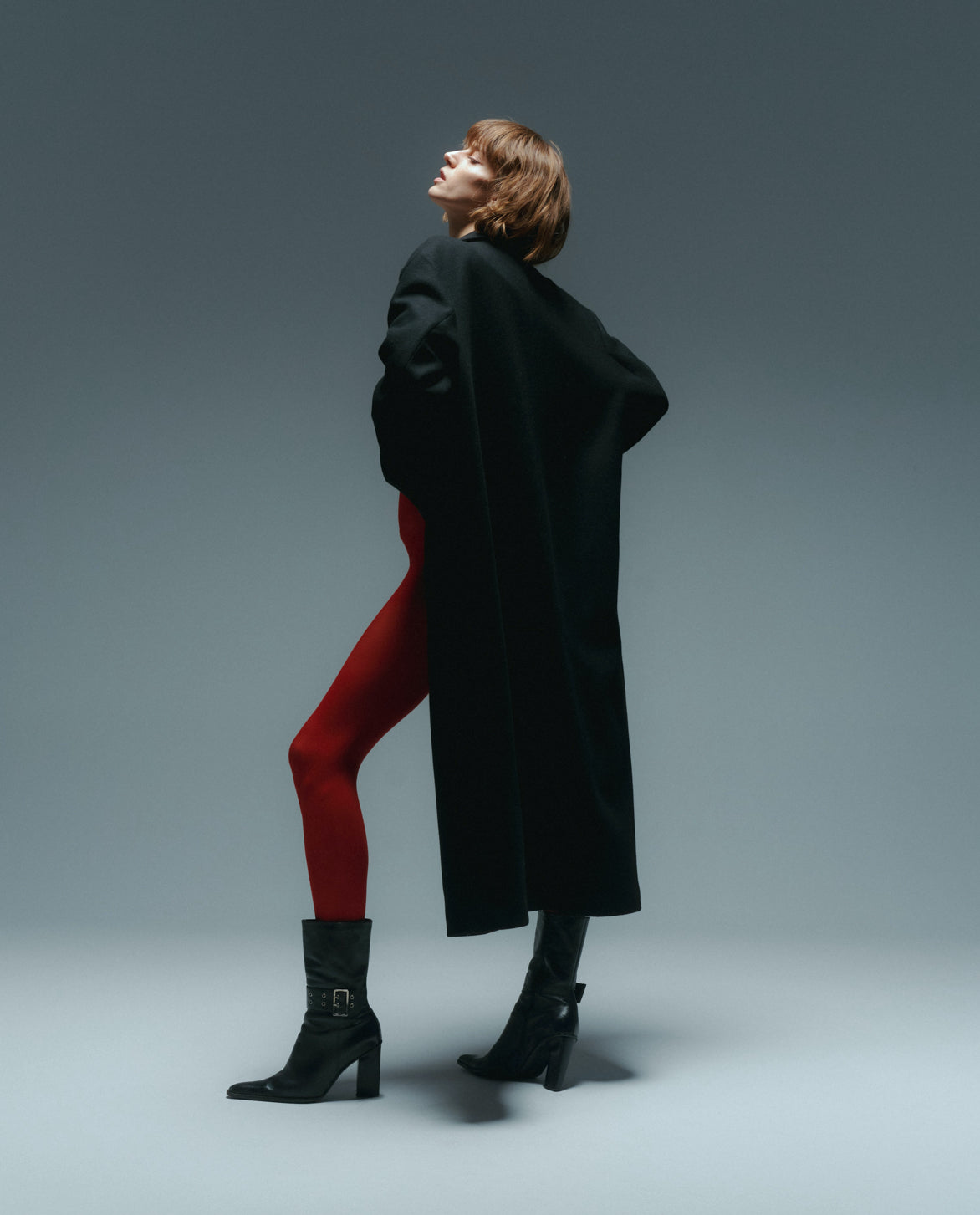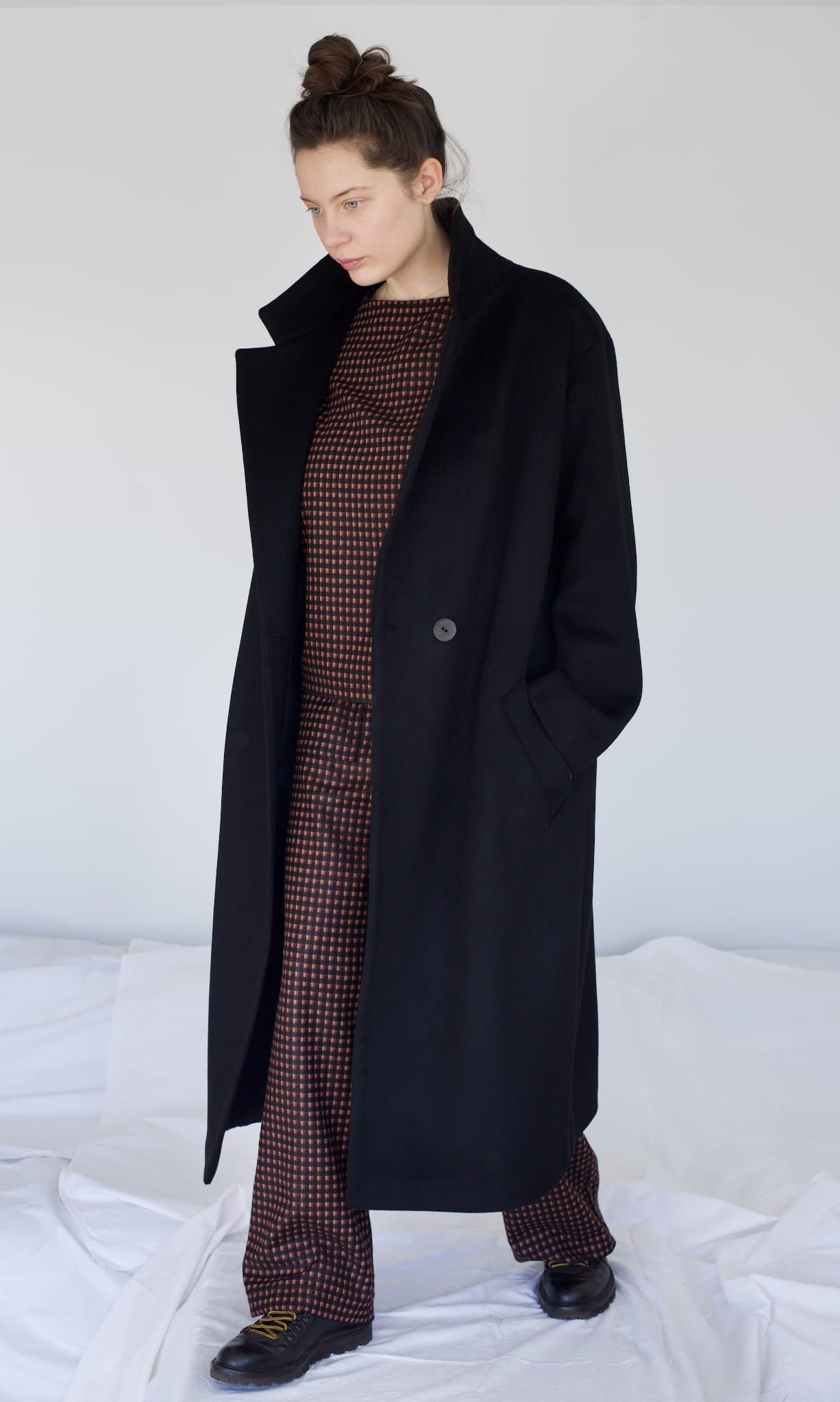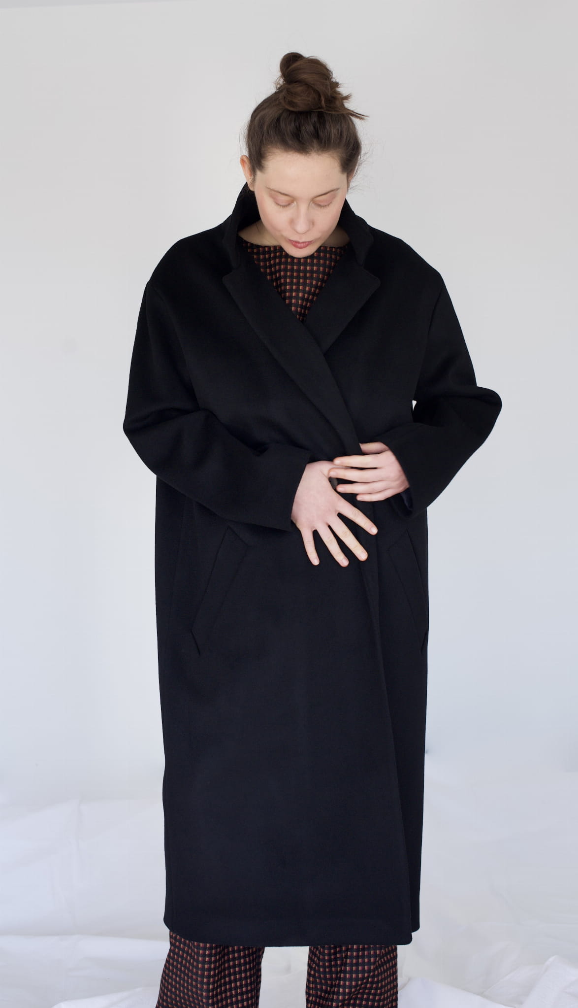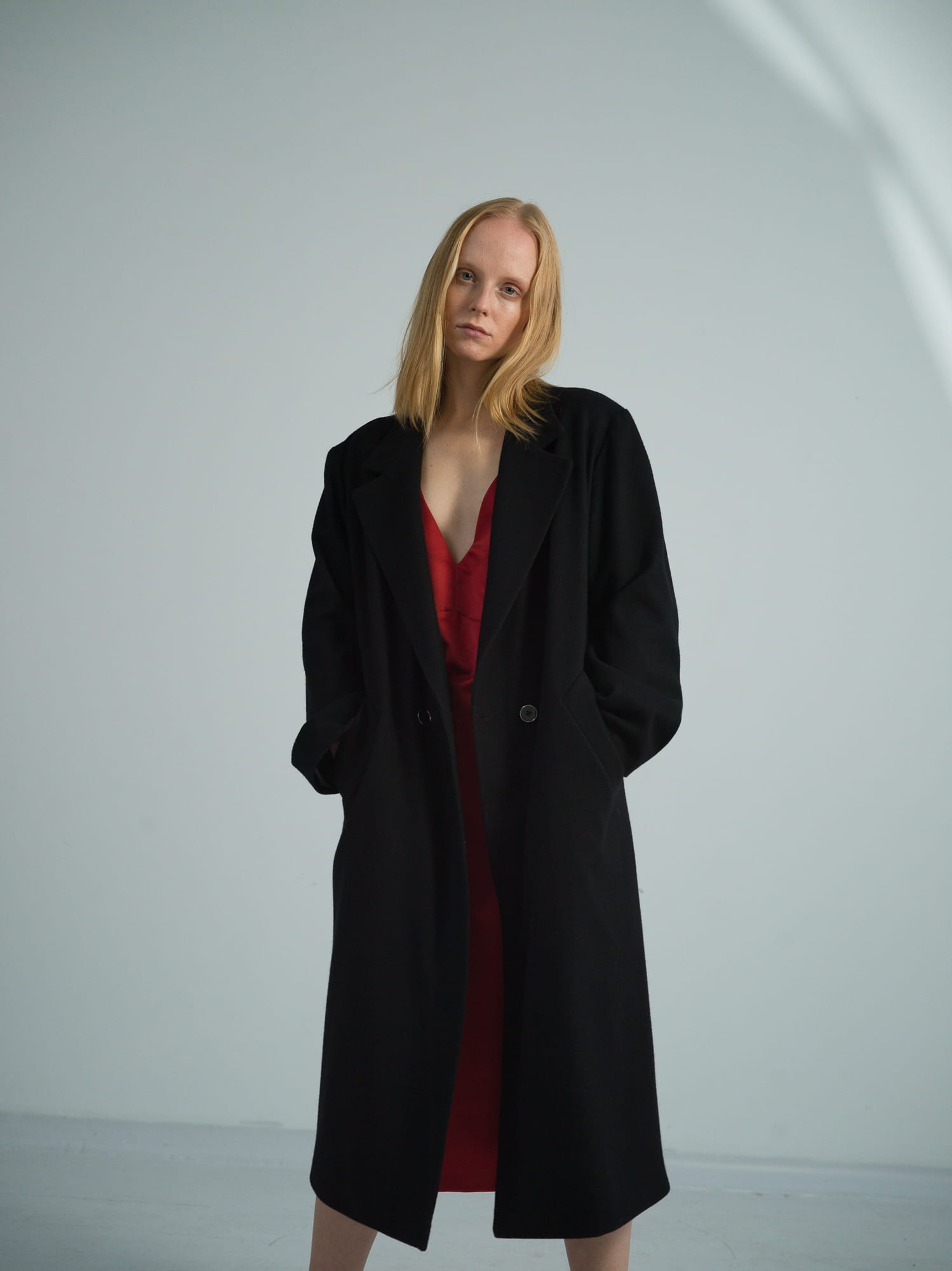 Czarny, dwurzędowy płaszcz. Uszyty jest z grubej wełny. Posiada wiskozową podszewkę. Jest oversizowy. Zapinany na metalowe guziki, posiada dwie kieszenie, rozcięcie z tyłu oraz lekko opuszczone szerokie ramiona. We wszystkich zimowych płaszczach wszyte jest również ocieplenie duńskie, które chroni przed wilgocią i zimnem.